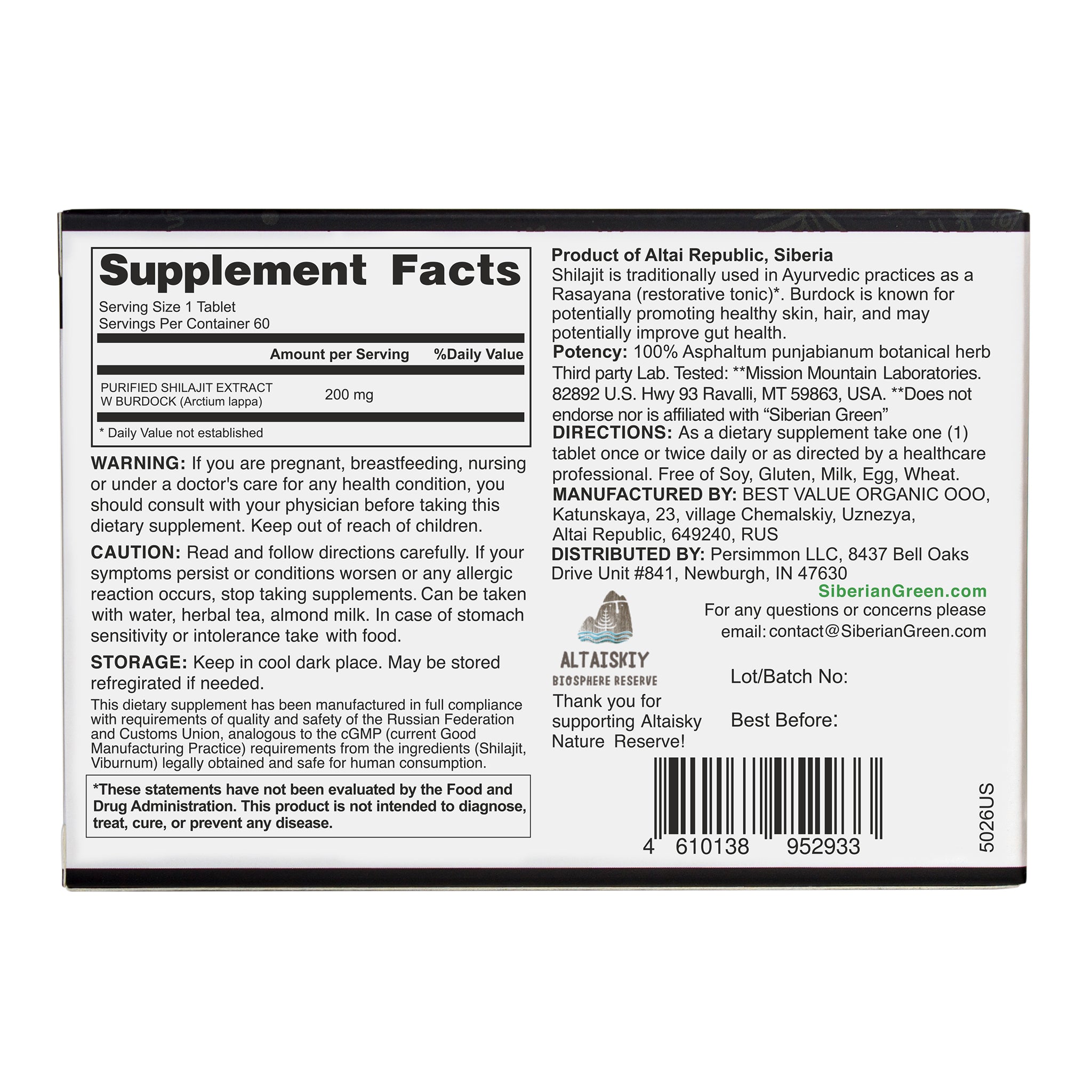 Each pack contains 60 individually portioned dry drops (200mg each), eliminating the mess and guesswork of traditional resins. Each dry drop combines 180 mg of pure Altai Shilajit resin with 20 mg Burdock Root herbal extract. That’s 180 tablets of pure Altai shilajit resin, tested for purity and safety in US-based third-party labs.
