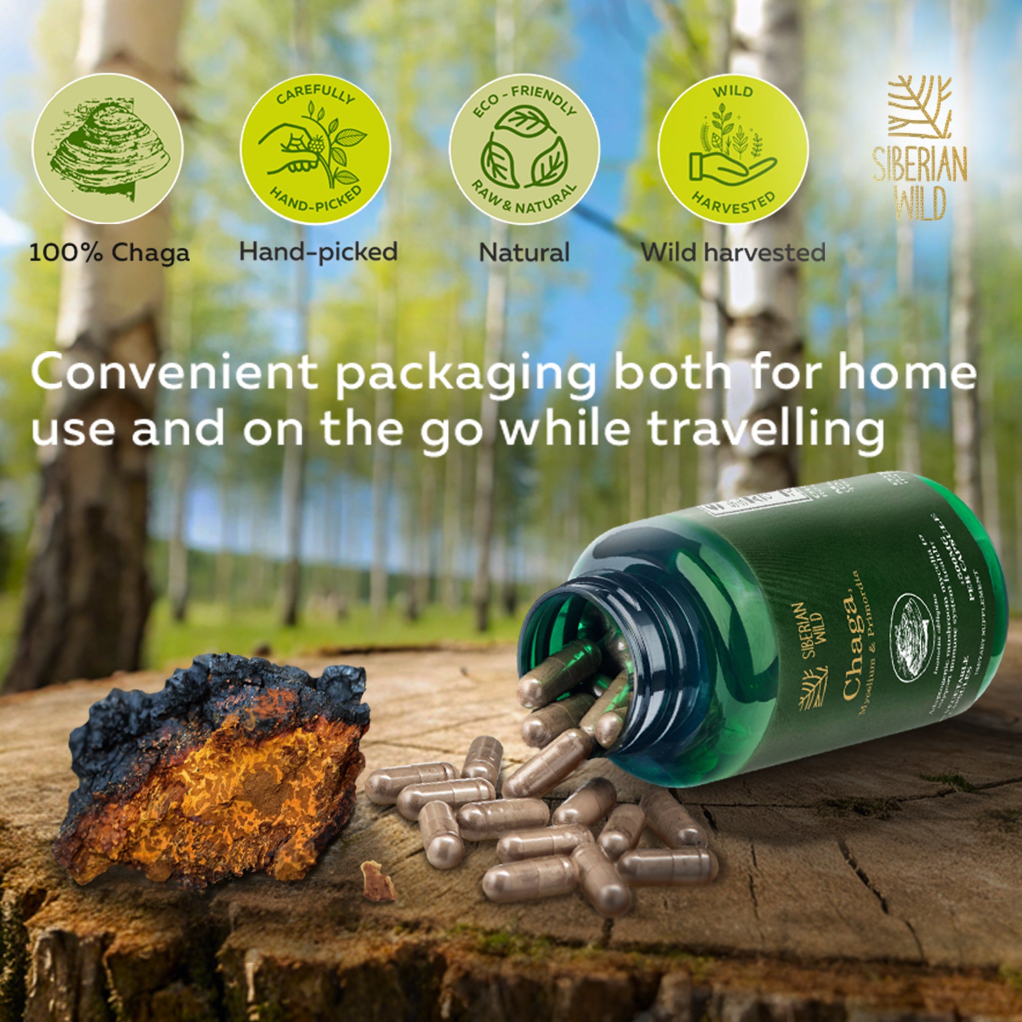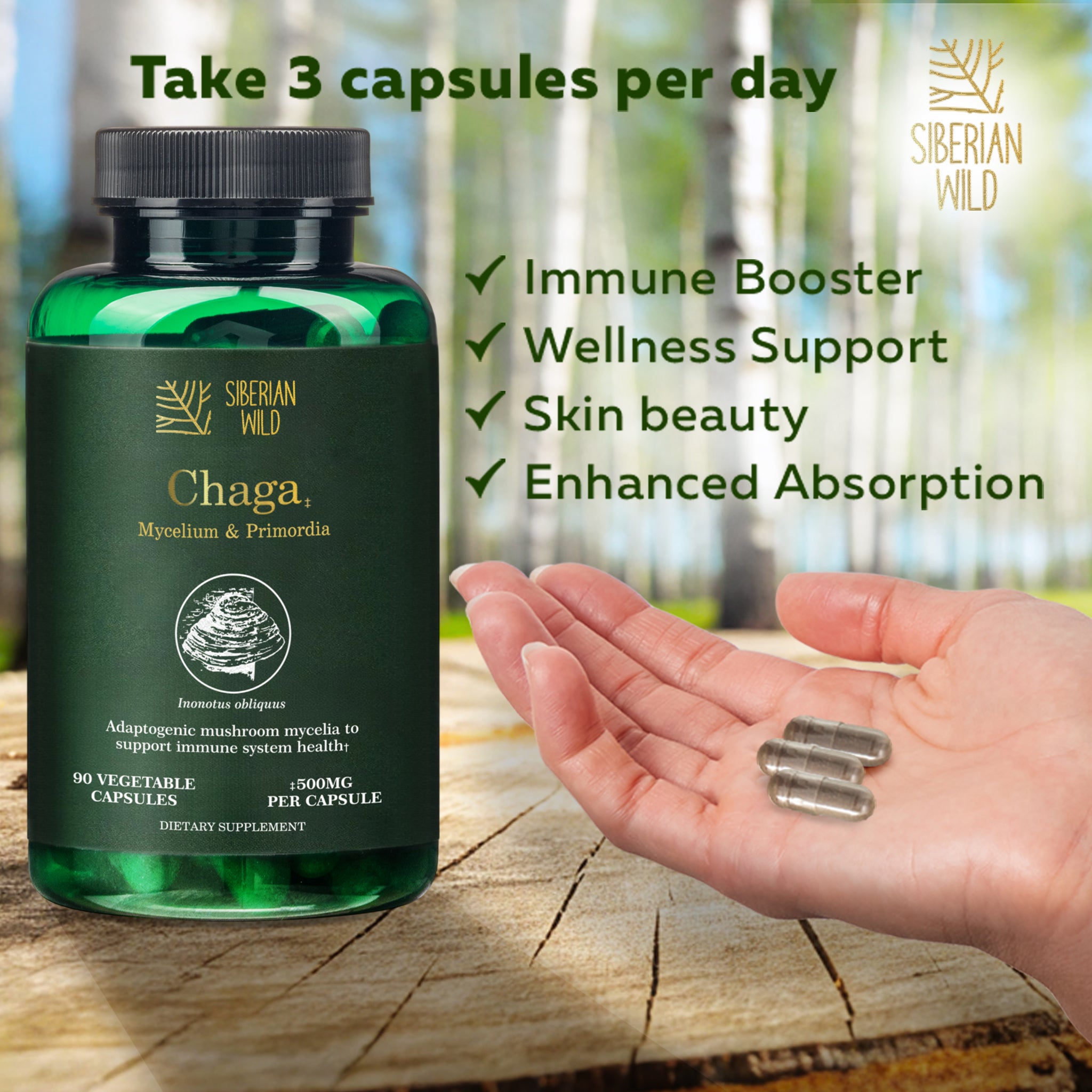 Strengthen the defenses of your body with the wild-harvested pure Chaga Mushroom, every wild Siberian Wild Chaga Mushroom Capsule is carefully manufactured into a powerful supplement to strengthen the immune system. This mushroom supplement for immunity helps provide vital antioxidants, minerals and nutrients aids all the way from the untouched forests of Altai in Siberia, most pure chaga coming from the perilous bear mountains.