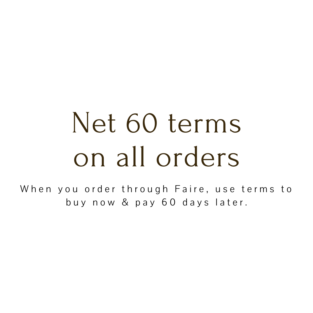 We’ve partnered with Faire to sell our wholesale products online. Join Faire today to shop our line and get $200 off and 1 year of free shipping.*